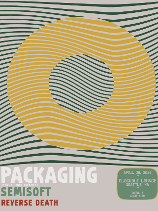 Clock-Out Lounge Presents:Packaging (Euro Tour Kick Off) Semisoft Reverse Death Thursday April 30th 8pm door $17adv/ $20 doshttps://packaging.bandcamp.com/album/packagingPackaging is the duo of Daniel Lyon (Spirit Award) and Daniel Connor Birch (Flaural).https://semisoftband.bandcamp.com/musichttps://reversedeath.bandcamp.com/album/return-to-the-mud