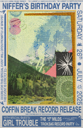 Coffin Break Record Release + Party Niffers Birthday Party feat.Coffin BreakGirl TroubleThe 5 Milds (Kurt Bloch, Dan Peters, Jim Sangster)and DJ sets by Trickbag Record Party Doors 8pm21+$15https://coffinbreak.bandcamp.com/Seattle based metal/punk/pop band est. 1987. https://girltrouble.bandcamp.com/album/hit-it-or-quit-it-klp229Garage rock via Tacoma! Formed in 1983, Kurt, Bon, Kahuna and Dale crashed into the music scene with their plywood speaker cabinets and a drum set purchased for $70 from the Sears surplus store in a shed beside Bon and Kahunas parents house, where they still practice today.