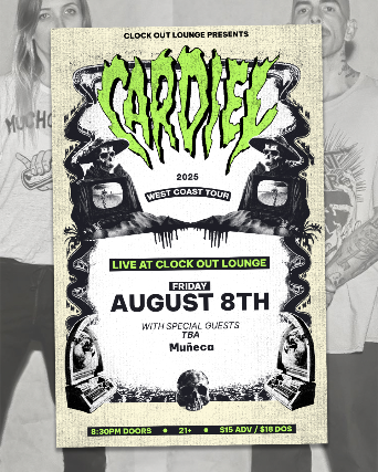 Clock-Out Lounge Presents:Cardiel w/ Muecaplus Tremens Friday August 8th8:30 doors21+ $15 adv / $18 dos https://cardiel.bandcamp.com/Fuzzy sludge and psychadelic dub.https://muneca-band.bandcamp.com/MUECA is a Seattle-based sludge metal punk rock band consisting of lead singer/guitarist Esli, drummer Cho, and bassist Ambika.https://tremenscore.bandcamp.com/album/tremensTremens plays heavy hardcore/punk/metal and hails from Seattle Washington.